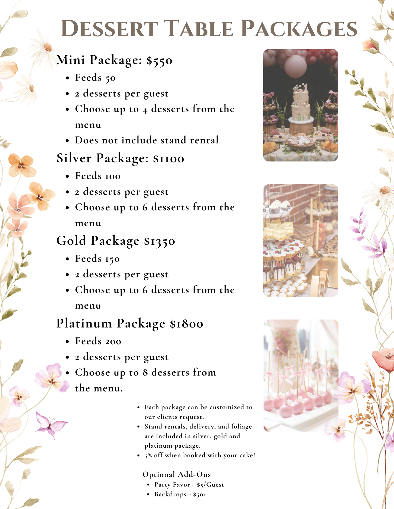 Every package includes a balanced dessert assortment, with guests enjoying two desserts per person, selected from our curated dessert menu. Packages are sized to match your guest count and can be customized to reflect your event style and flavor preferences.