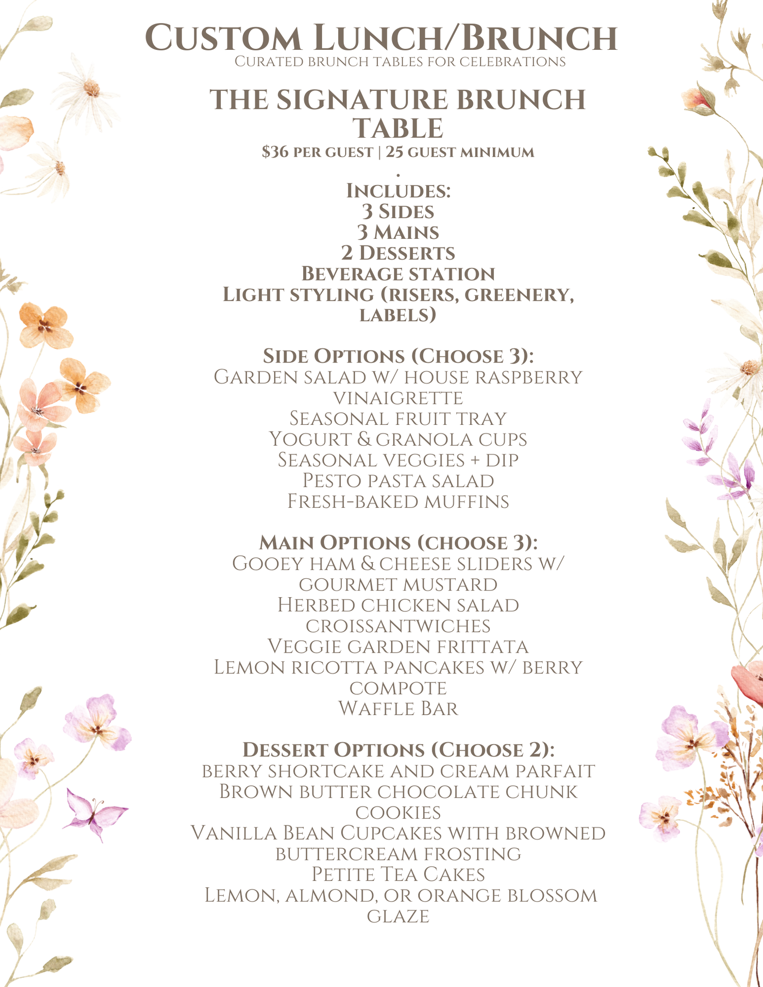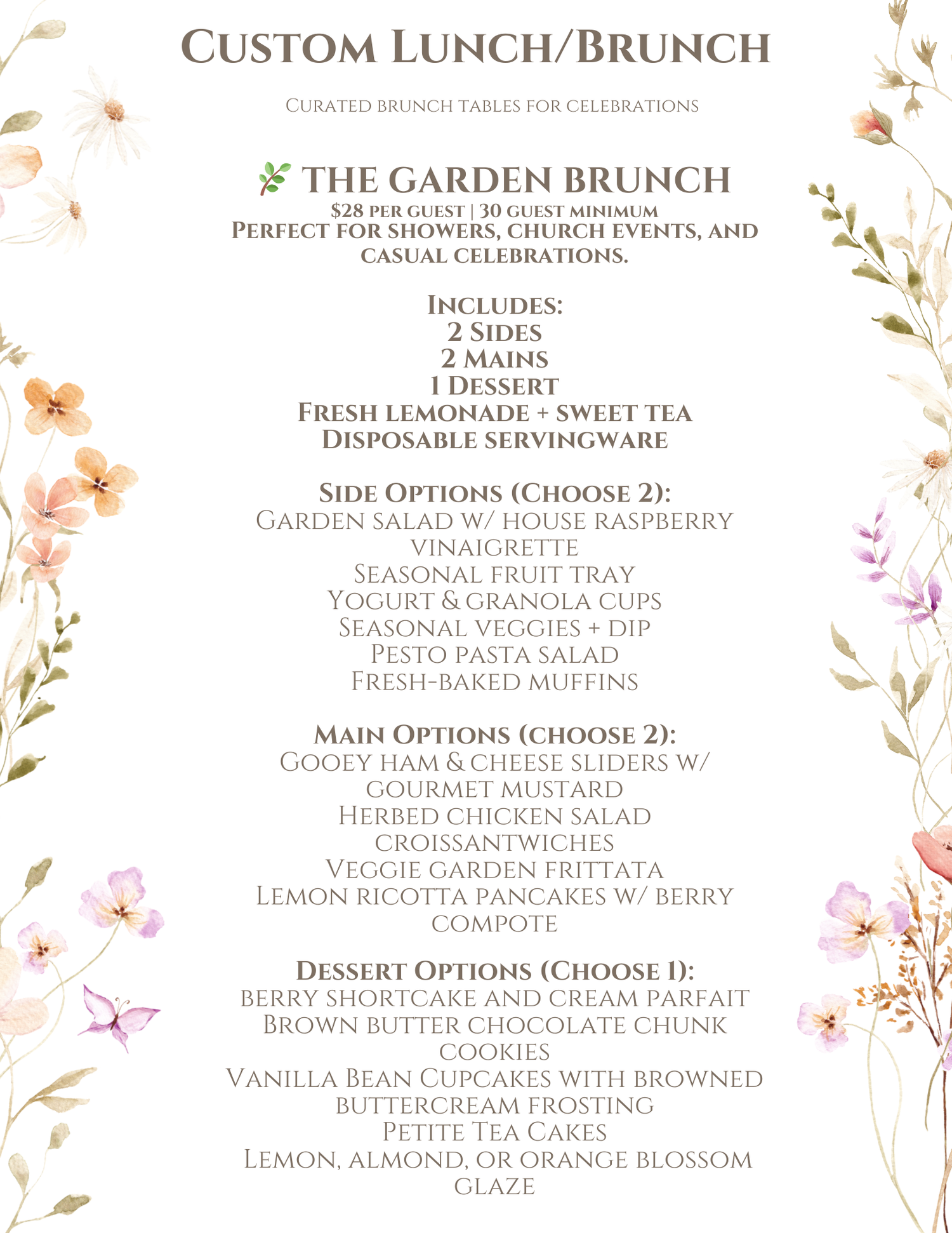 Built to serve 30 guests minimum, the Garden Brunch includes a balanced mix of savory mains, fresh sides, and a sweet finish—paired with refreshing beverages and easy disposable servingware to keep hosting stress-free.